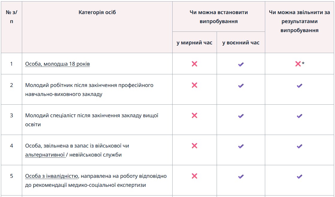 У мирний час заборонено встановити випробування під час прийняття певним категоріям осіб (ч. 3 ст. 26 КЗпП). Ця заборона — безапеляційна. Не встановлюйте випробування, навіть якщо працівник згоден.