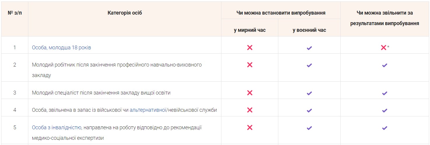 Встановіть випробування новому працівнику за алгоритмом та зразками від експертів. Врахуйте приклад із судової практики, щоб не опинитися в суді. Скористайтеся таблицею, щоб перевірити, кому з працівників не доцільно встановлювати випробування під час дії воєнного стану