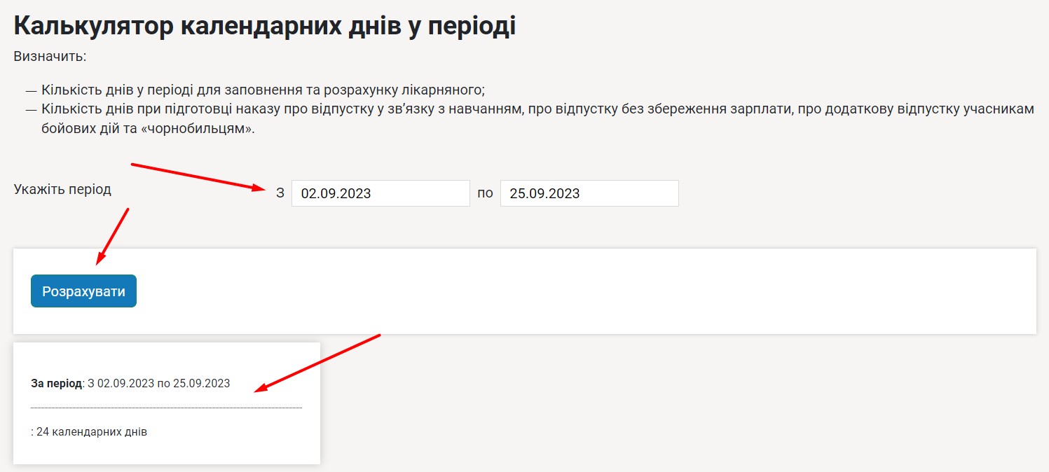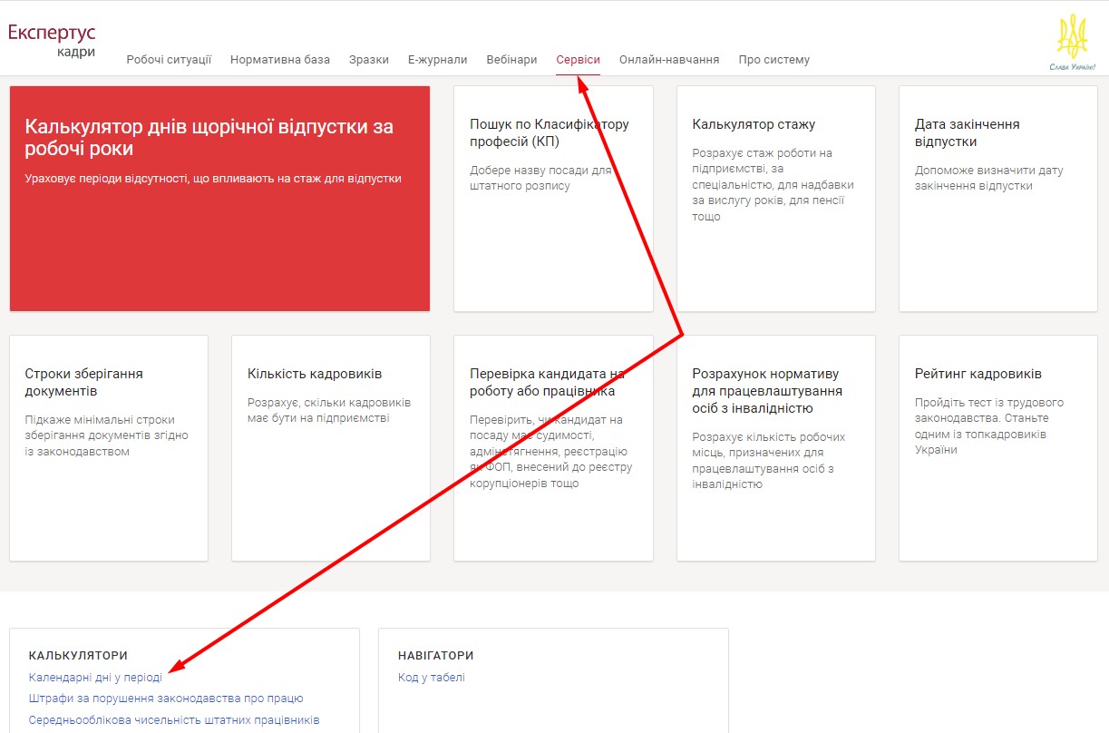 Калькулятор календарних днів у періоді розміщений на плашці «Калькулятори» у розділі «Сервіси» системи «Експертус Кадри».