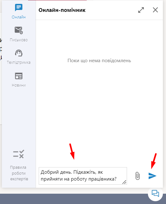 2. Для того щоб надіслати своє звернення в чаті, упишіть його в порожньому рядку й відправте за допомогою значка, позначеного на скріні нижче.