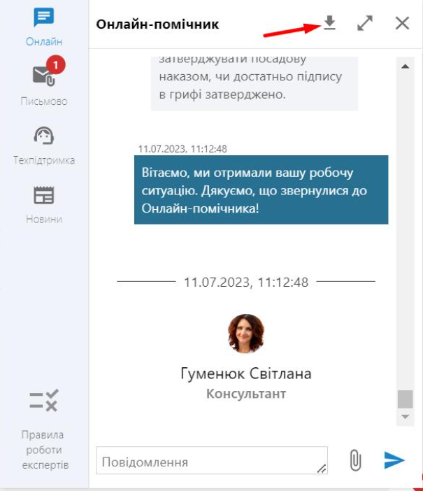 10. Якщо хочете скачати переписку з експертом онлайн-помічника в розділах «Онлайн» чи «Письмово», клікніть на стрілочку.