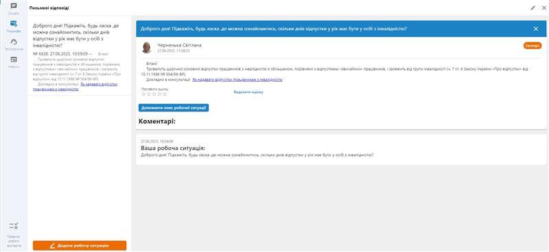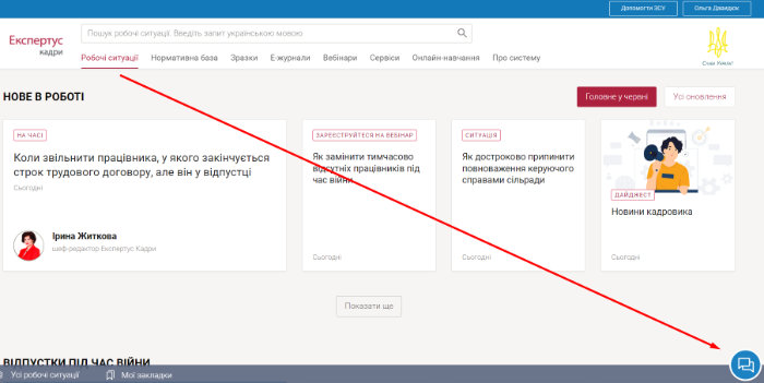 1. Якщо ви не знайдете в базі даних експертно-правової системи «Експертус Кадри» опису робочої ситуації, яка аналогічна вашій, то можете надіслати звернення до нашої експертної підтримки за допомогою синьої кнопки «Онлайн-помічник», що розміщена в правому нижньому куті сторінки.