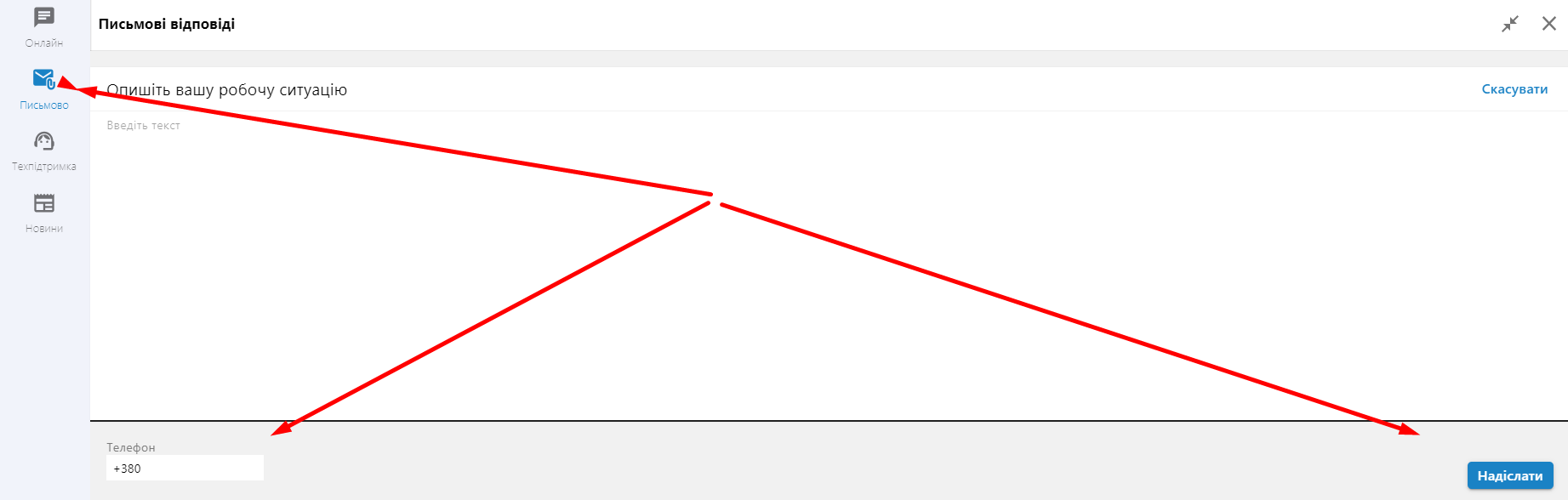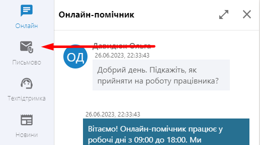- перейдіть у розділ «Письмово» у віджеті Онлайн-помічника;