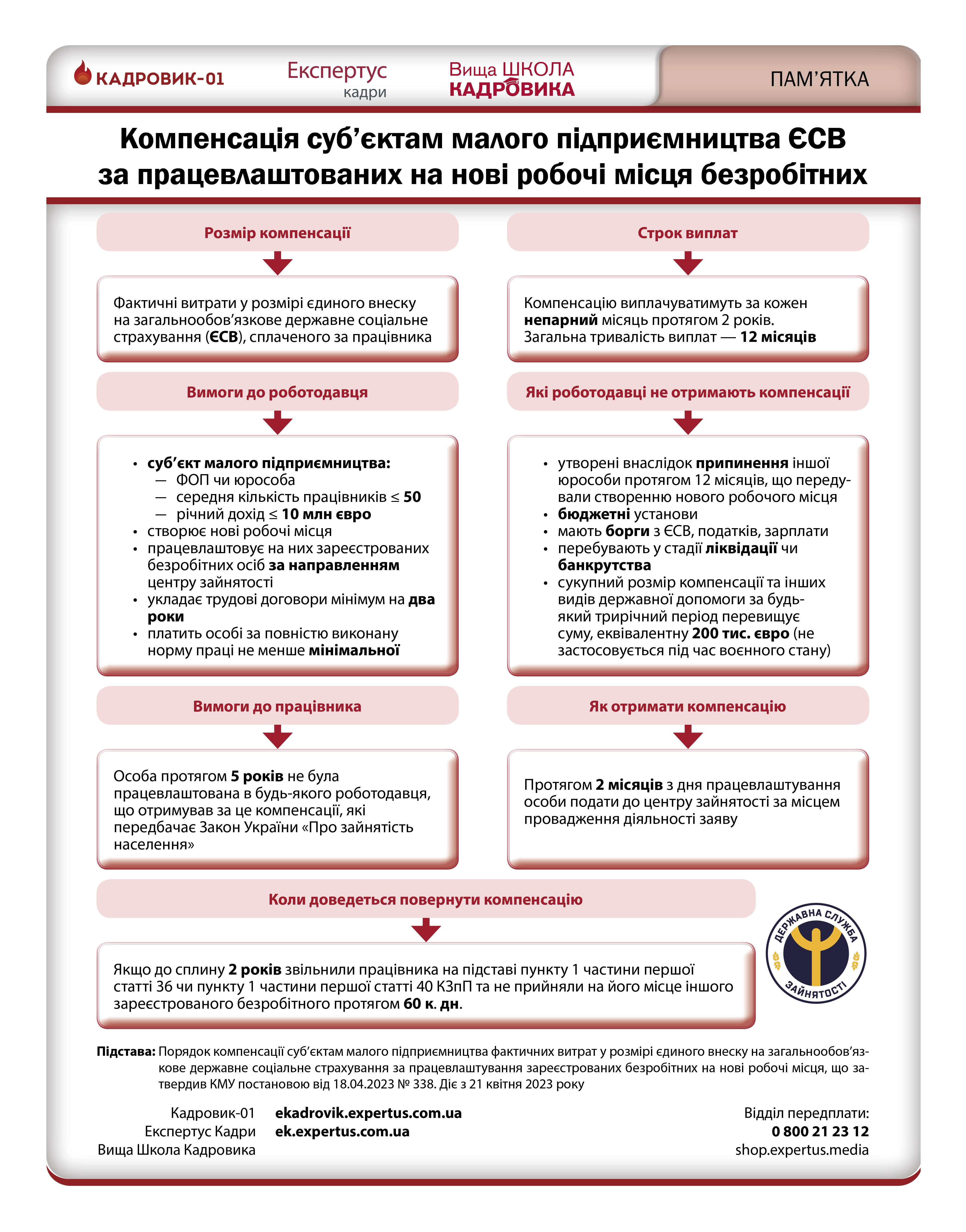 Докладніше про процедуру:Компенсація фактичних витрат суб'єктам малого підприємництва за працевлаштування безробітних на нові робочі місця