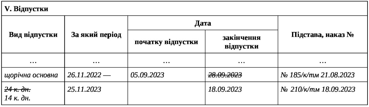 Унесіть запис про відкликання працівника з відпустки в розділ V «Відпустки» особової картки.