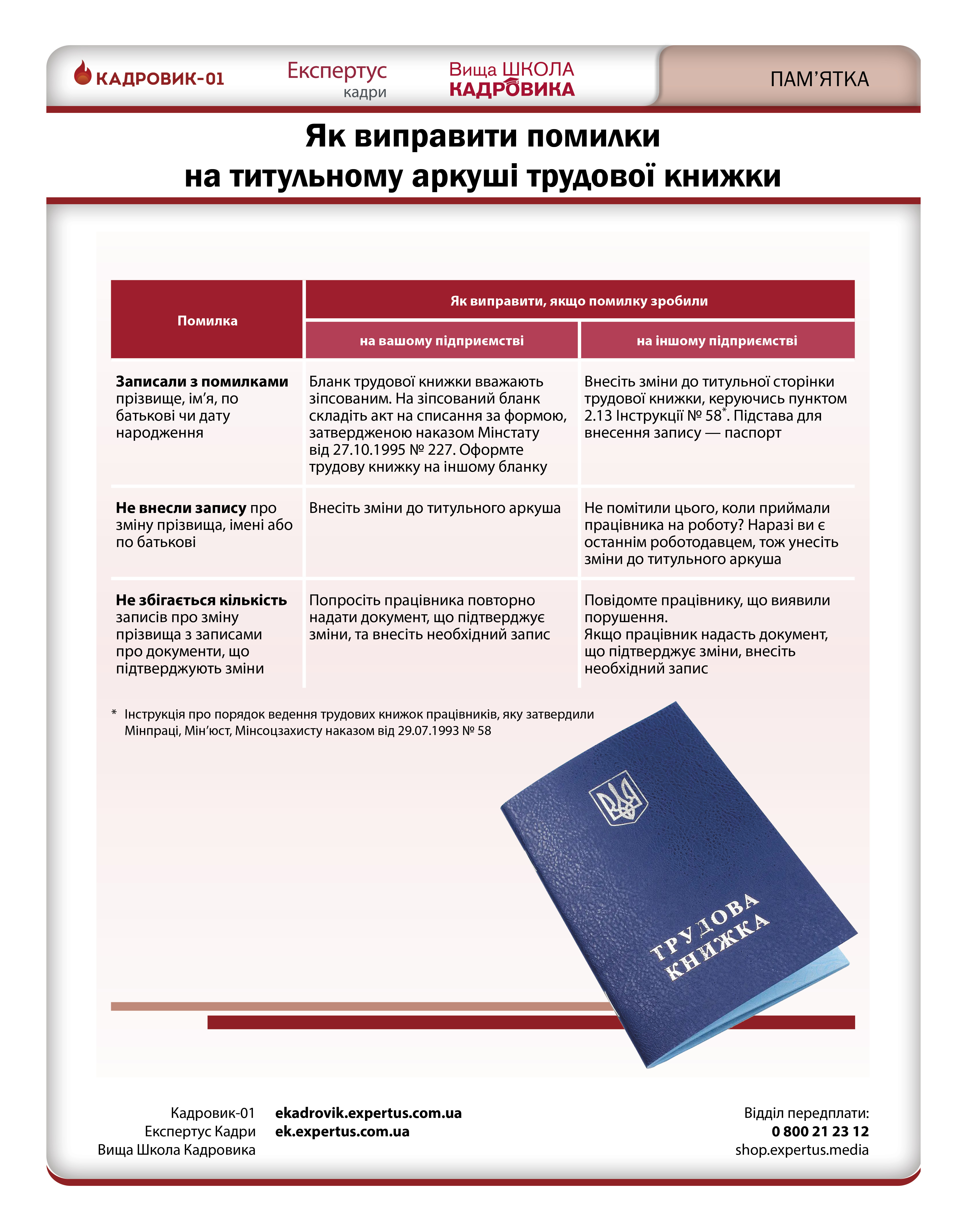 Докладніше про процедуру:Як виправити неправильний запис на титульній сторінці трудової книжки