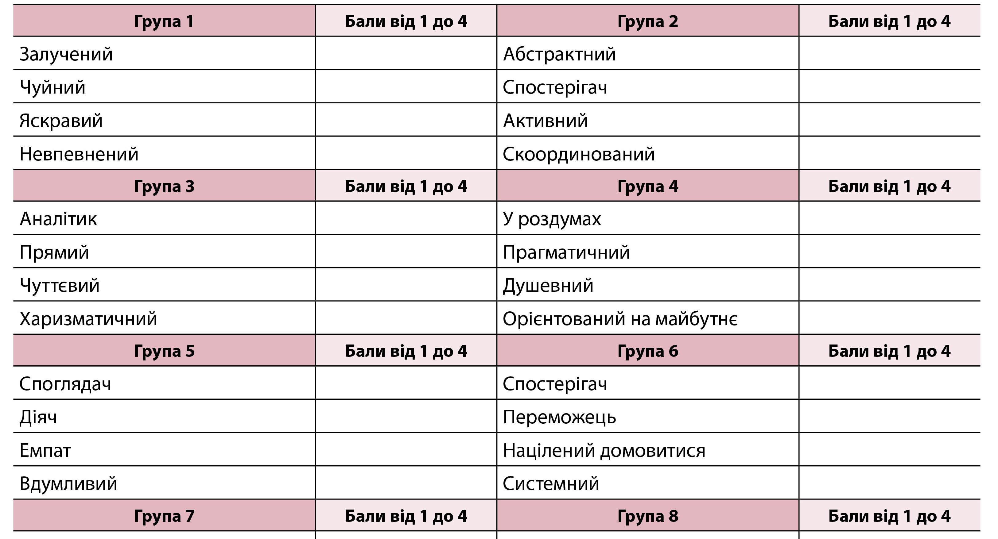 Визначте свій код за Адізесом. Оцініть ваші особисті характеристики, які стосуються роботи. У кожній групі розставте бали від 1 — «найменше мені підходить» до 4 — «найбільше мені підходить». Цифри в межах групи не можуть повторюватися — сума балів у кожній групі повинна дорівнювати 10. Оцінюйте свої дії, а не те, як бачите себе!