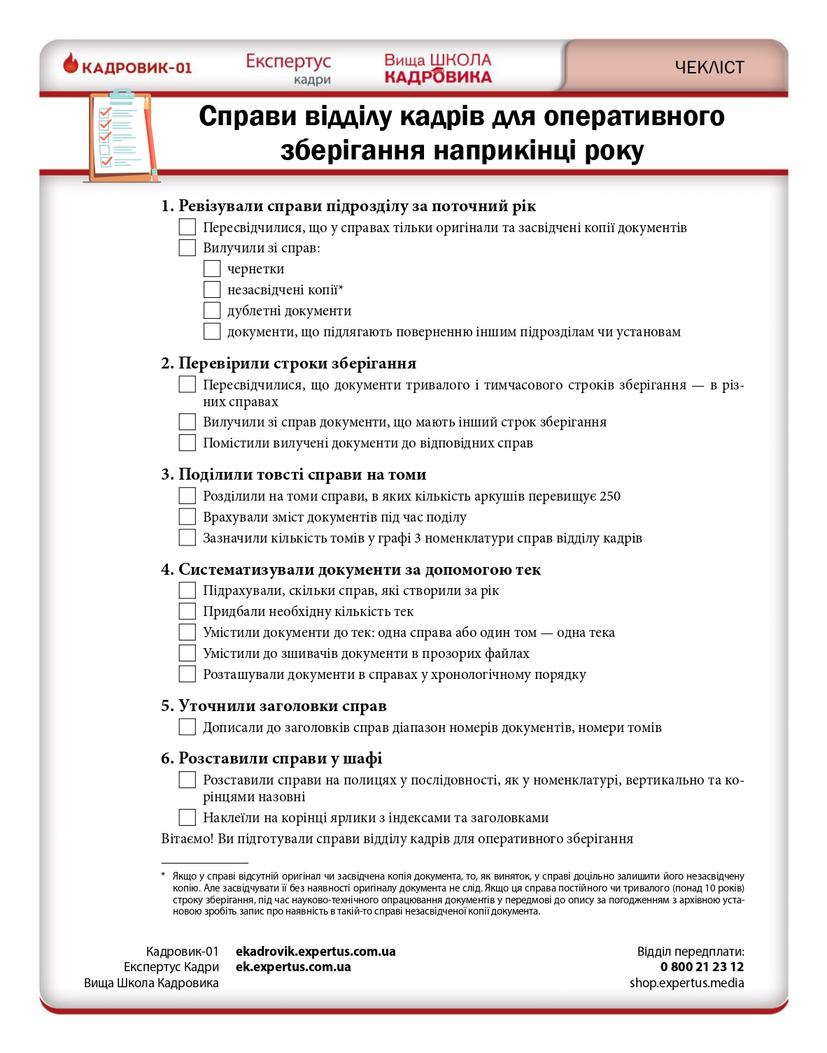 Чекліст. Справи відділу кадрів для оперативного зберігання наприкінці року