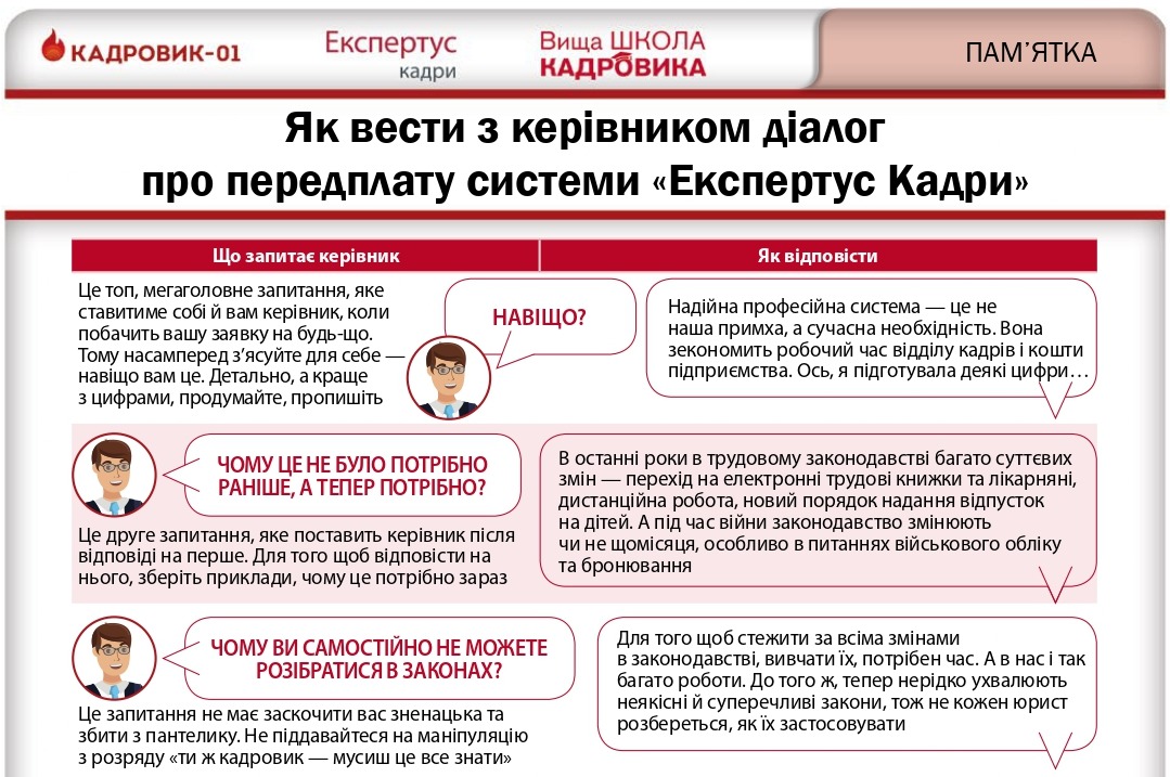 Я комунікую з керівниками різних рівнів і нерідко бачу здивування в їхніх очах, коли озвучую базові потреби кадровиків їм особисто. Керівники здебільшого думають, що за закритими дверима кабінету кадрової служби все відбувається само собою — «воно там якось працює, і добре». Але може бути й недобре, адже по допомогу кадровики звертаються тоді, коли самостійно розв’язати робочу ситуацію вже несила.
