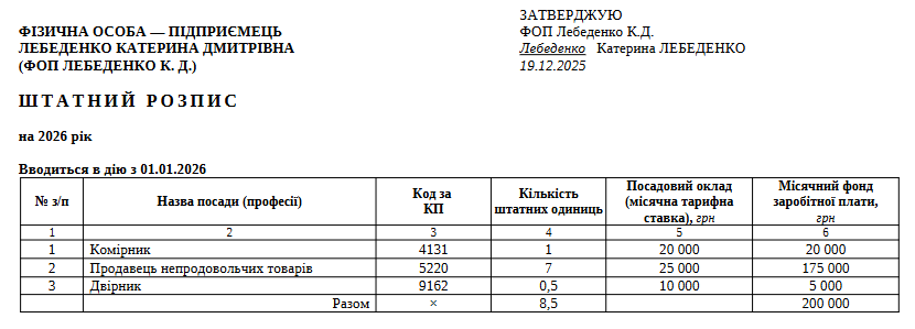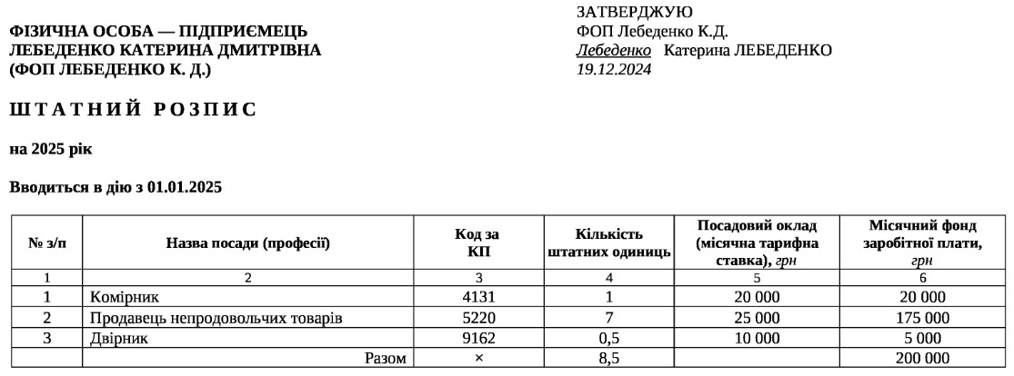 3) форма штатного розпису для ФОП-роботодавця. Редакція Експертус Кадри у формі врахували: