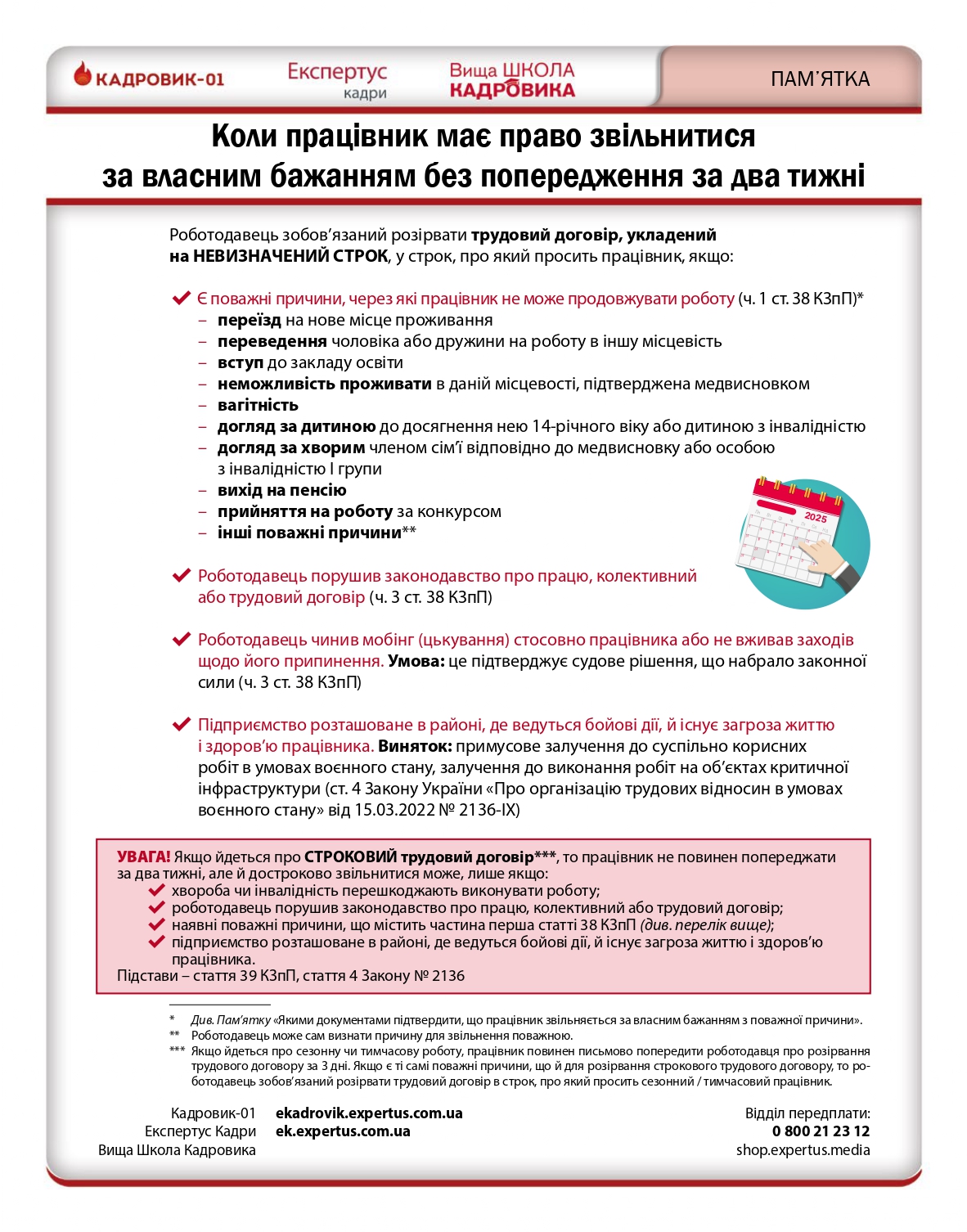 Пам’ятка. Коли працівник має право звільнитися за власним бажанням без попередження за два тижні