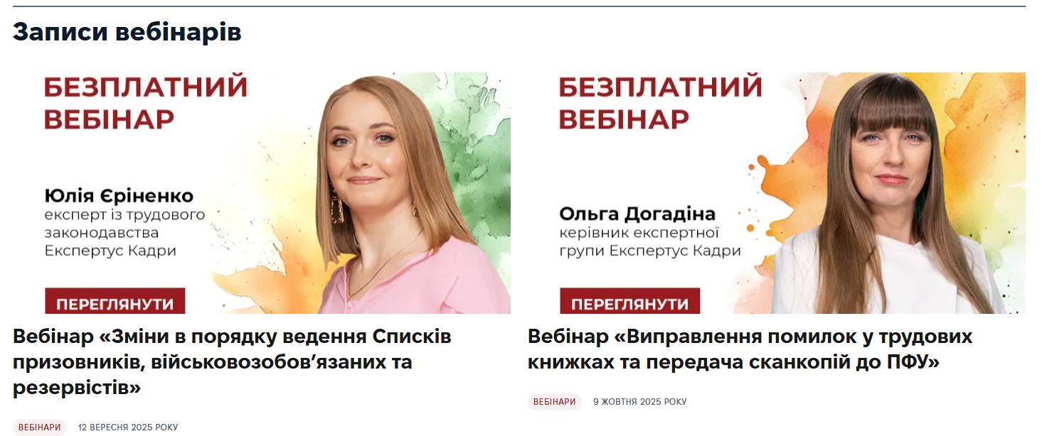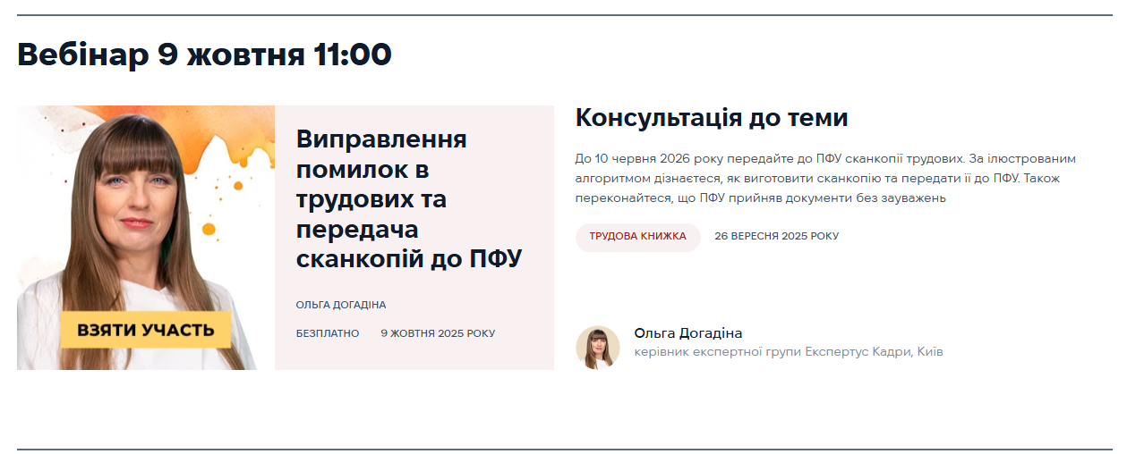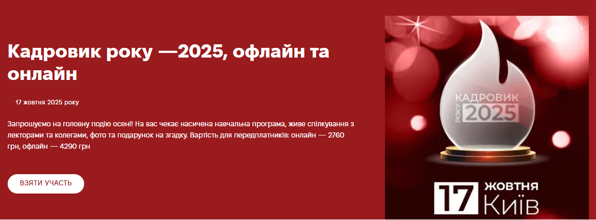 Окрім вебінарів, із головної сторінки легко потрапити на інші заходи від Експертус Кадри. Наприклад, на семінар «Кадровик року» або Конгрес кадровиків (рис. 9). Це заходи, на яких ви отримаєте знання, кейси, відповіді на робочі запитаннята поспілкуєтеся з однодумцями.