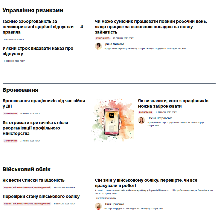 Тематичні блоки на головній сторінці — як стовпи кадрової роботи. Ви швидко перейдете на важливі для вас консультації, покрокові алгоритми чи роз’яснення і знатимете тему від А до Я. Зверніть увагу на Управління ризиками — це аналітичні публікації, які допоможуть ухвалити правильне для підприємства рішення й врахувати всі плюси та мінуси цього рішення (рис. 8).
