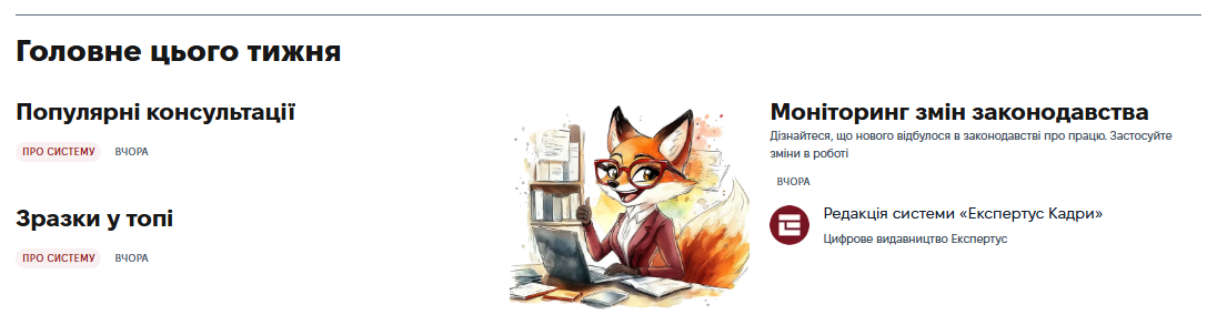 Головна сторінка системи «Експертус Кадри» — динамічна й наповнена найцікавішою професійною інформацією. Переглядайте її щодня, щоб знайти все, що потрібно для роботи саме сьогодні.