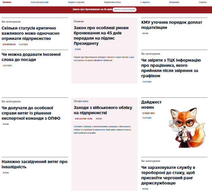 Консультації, зразки, статті, шпаргалки, довідники, новини — щодня на головній сторінці. Ці публікації, гарячіші за ранкову каву, щоб вдало почати робочий день (рис. 4).